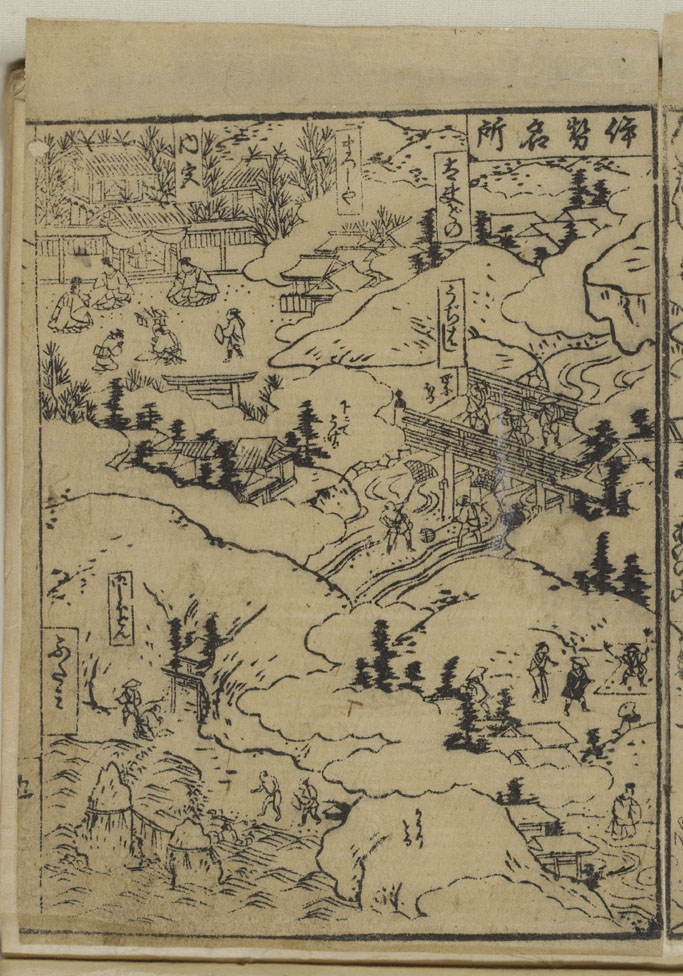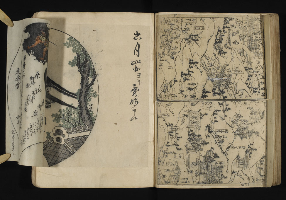請求記号:文庫08 J53(1 2) ; 製作・刊行年等:文化元年 ; 数量:二冊 ; 材質:紙本彩色 ; 大きさ:27×22.6 ; 解説文:森島中良(1754-1810)は桂川国瑞の弟で、蘭学者としてのみならず、森羅万象、二世風来山人などの号をもつ戯作者としても名高い。長崎に舶載された珍しい品物の広告や商標、蘭文など雑多なものが貼り込まれている。 |