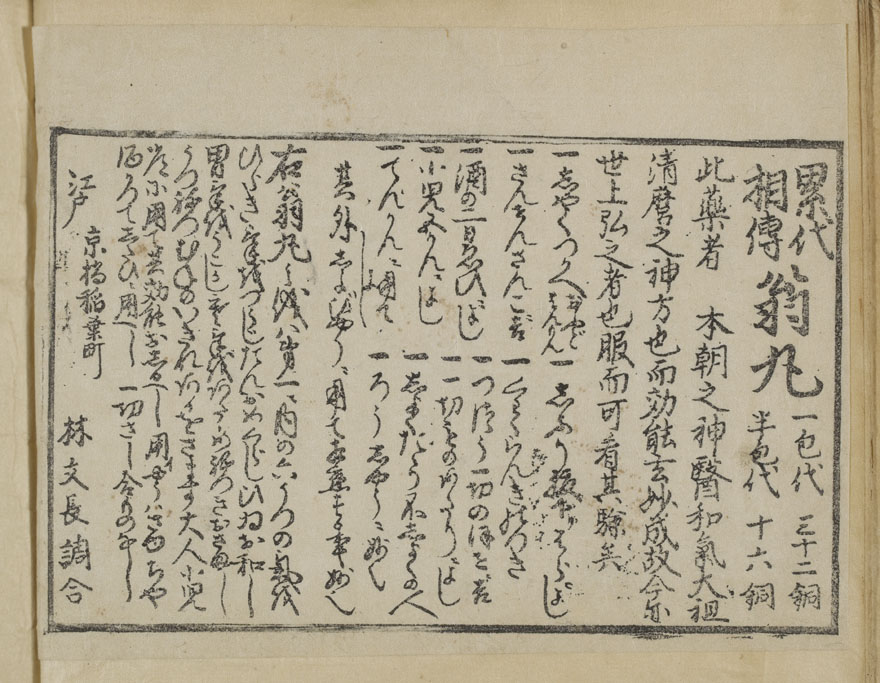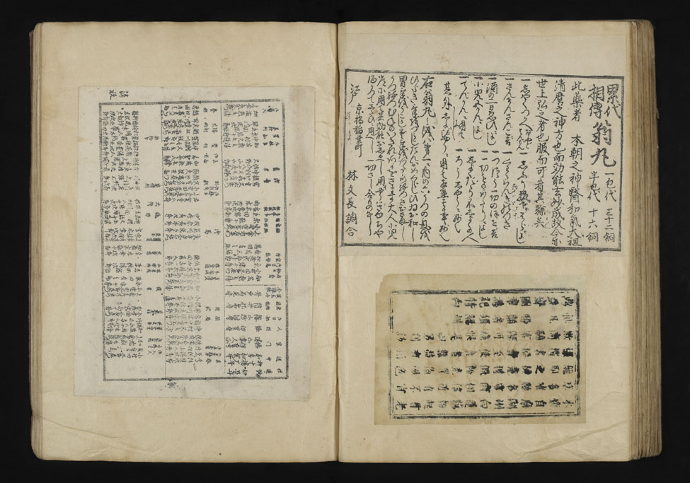 請求記号:文庫08 J53(1 2) ; 製作・刊行年等:文化元年 ; 数量:二冊 ; 材質:紙本彩色 ; 大きさ:27×22.6 ; 解説文:森島中良(1754-1810)は桂川国瑞の弟で、蘭学者としてのみならず、森羅万象、二世風来山人などの号をもつ戯作者としても名高い。長崎に舶載された珍しい品物の広告や商標、蘭文など雑多なものが貼り込まれている。 |