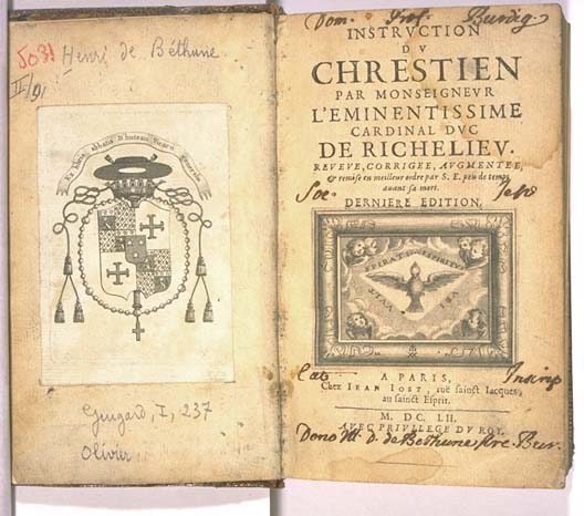 RECHELIEN, Armand Jean du Plessis, duc de, 1585-1642. Instrvction dv chrestien / par Monseignevr l'Eminentissime cardinal dvc de Richeliev. Reveve corrigee, avqmentee, ... Derniere edition. A Paris : Chez Iean Lost, rue sainct Iacques, au sainct Esprit, M. DC. LII. [1652]. 12mo. 154 x 90 mm 旧蔵者:(紋章)Henri de Bethune;(MS)Dono M. D. de Bethune; Dom. Irof (?) Burdgi;(蔵書票)Ex libris abbatis D'huteau Vicarii generalis ; Bruno Monnier, chateau de Montry, Jura. 受入番号:010791077619(リシュリュー・コレクション) |