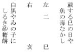 貞門の俳人、野々口立圃(1595-1669)の自筆句合画巻。十二支の動物に装束を着せて一対ずつ左右に向かわせ、立圃自作の発句を合わせたもの。動物の組み合わせは、辰と戌、巳と亥のように、7番目同士を合わせる「七ツ目」というめでたい組み方で配列されている。最初の辰と戌の組には、辰に「夕立の水上いづこたつの口」、戌に「犬山やふるもまだらの雪の色」とある。奥書に「七十二老」とあり、寛文6年(1666)の染筆とわかる。