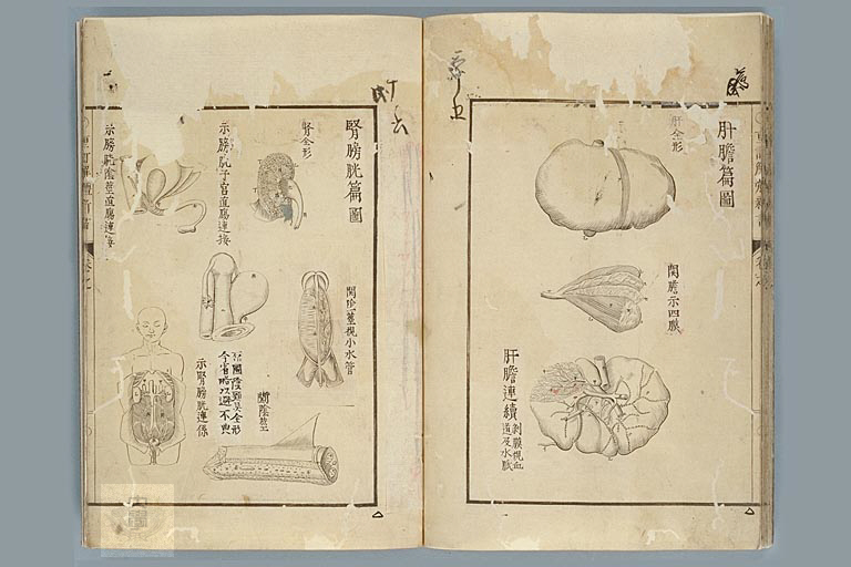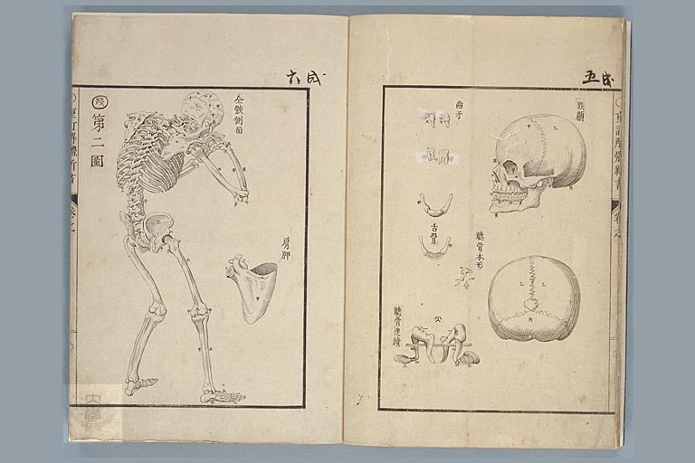 請求記号:文庫08 A28,29 ; 製作・刊行年等:安永3年 ; 数量:十冊(内1巻欠) ; 材質:銅版版下 ; 解説文:『解体新書』の改訂版。原著はヨハン・アダム・クルムス(JOHAN ADAM KULMUS)著ANATOMISCHETABELLEN(解剖学表1732),のオランダ語訳書ONTLEED KUNDIGE TAFELEN(1734),いわゆるターヘル・アナトミアである。同書の杉田玄白,前野良沢らによる漢文訳は『解体新書』として安永3年(1774)に刊行された。玄白はその改訂を弟子の大槻玄沢に委嘱し,改訂版である『重訂解体新書』は寛政10年(1798)に完成した。大槻家旧蔵。刊行は文政9年(1838)。