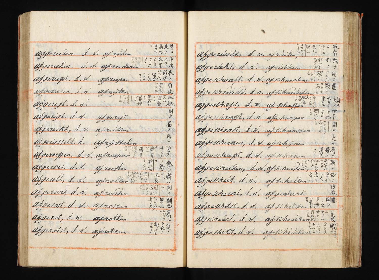 解説:波留麻和解(はるまわげ)は寛政8年(1796)に成立したわが国最初の蘭和辞書である。蘭学者稲村三伯(1759-1811)が石井恒右衛門、宇田川玄随らの協力を得て、オランダの出版業者フランソワ・ハルマ Francois Halma(1653-1722)の著わした蘭仏辞典 Woordenboek der Nederduitsche en Fransche Taale, 1708 を底本として、オランダ語の見出し語一つ一つに和訳語をあてたものである。また、稲村三伯のものとは別に、オランダ商館長ヘンデレキ・ドゥーフの指導のもとに、同じハルマの蘭仏辞典を用いて中山得十郎、吉雄権之助らが文化13年(1816)に完成させた蘭和辞書を「ドゥーフハルマ」もしくは「長崎ハルマ」と通称し、稲村三伯のものはこれに対して「江戸ハルマ」と呼ばれる。「波留麻和解」はその後の蘭学の発達や海外文献の翻訳の進展に、おおいに与って力があり、大きな影響を与えた文化史的意義の大きな資料である。たとえば、オランダ語の「ナトゥール」(natuur)に、もともと中国語で道教的な意味を持っていた「自然」という訳語をあてたのも、この「波留麻和解」においてであり、西洋文明と近代文明を受容してゆく過程において、日本語を大きく変え、ひいては日本人の意識を変える原動力ともなった書物ということができる。