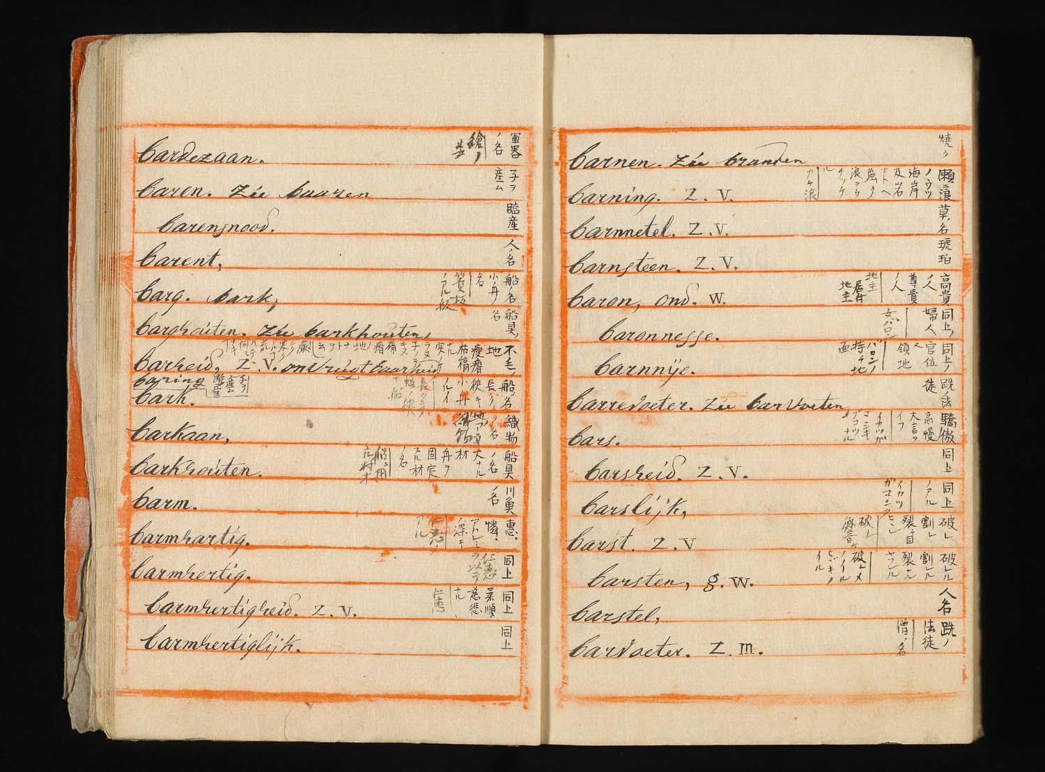 解説:波留麻和解(はるまわげ)は寛政8年(1796)に成立したわが国最初の蘭和辞書である。蘭学者稲村三伯(1759-1811)が石井恒右衛門、宇田川玄随らの協力を得て、オランダの出版業者フランソワ・ハルマ Francois Halma(1653-1722)の著わした蘭仏辞典 Woordenboek der Nederduitsche en Fransche Taale, 1708 を底本として、オランダ語の見出し語一つ一つに和訳語をあてたものである。また、稲村三伯のものとは別に、オランダ商館長ヘンデレキ・ドゥーフの指導のもとに、同じハルマの蘭仏辞典を用いて中山得十郎、吉雄権之助らが文化13年(1816)に完成させた蘭和辞書を「ドゥーフハルマ」もしくは「長崎ハルマ」と通称し、稲村三伯のものはこれに対して「江戸ハルマ」と呼ばれる。「波留麻和解」はその後の蘭学の発達や海外文献の翻訳の進展に、おおいに与って力があり、大きな影響を与えた文化史的意義の大きな資料である。たとえば、オランダ語の「ナトゥール」(natuur)に、もともと中国語で道教的な意味を持っていた「自然」という訳語をあてたのも、この「波留麻和解」においてであり、西洋文明と近代文明を受容してゆく過程において、日本語を大きく変え、ひいては日本人の意識を変える原動力ともなった書物ということができる。