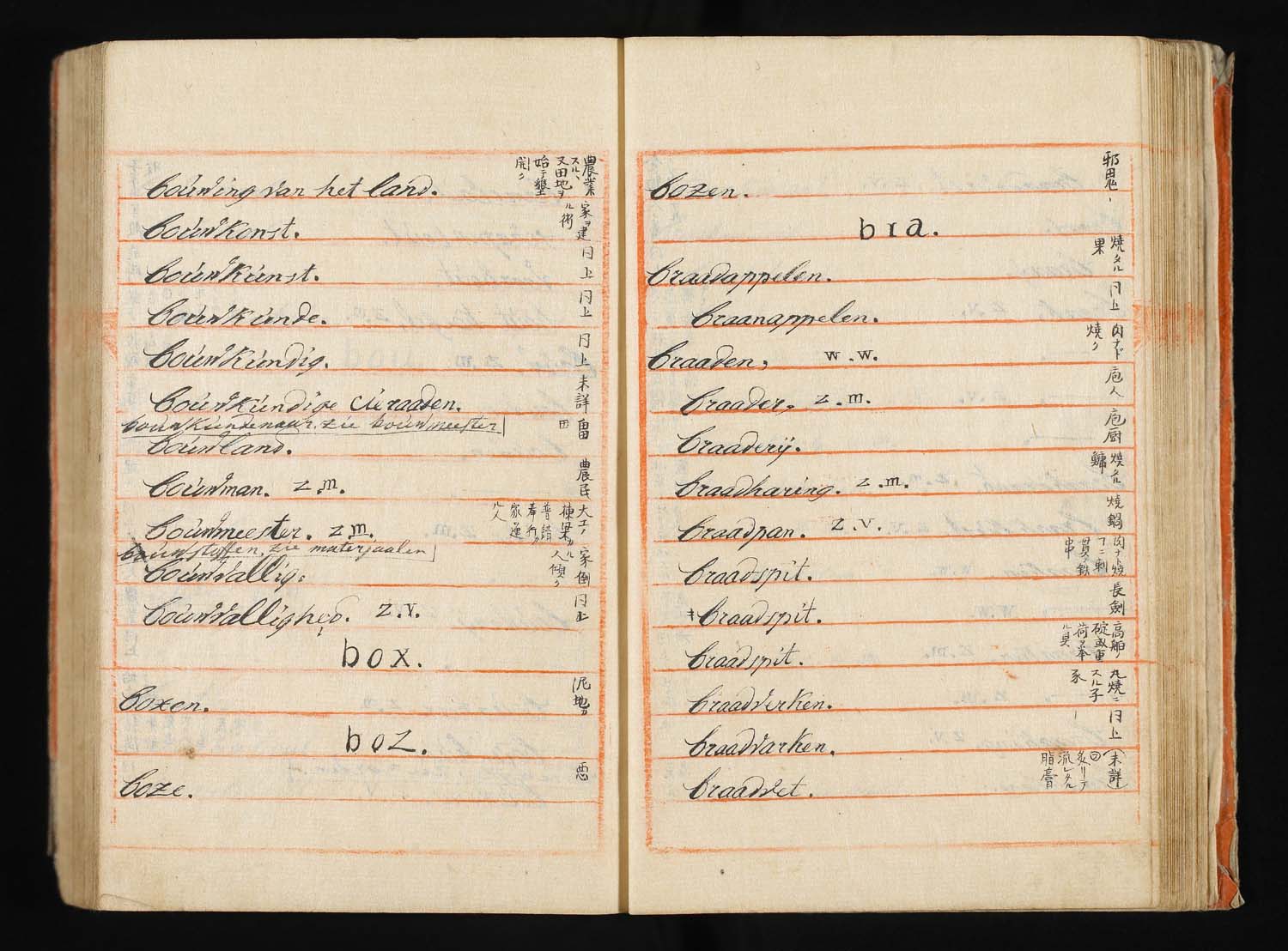 解説:波留麻和解(はるまわげ)は寛政8年(1796)に成立したわが国最初の蘭和辞書である。蘭学者稲村三伯(1759-1811)が石井恒右衛門、宇田川玄随らの協力を得て、オランダの出版業者フランソワ・ハルマ Francois Halma(1653-1722)の著わした蘭仏辞典 Woordenboek der Nederduitsche en Fransche Taale, 1708 を底本として、オランダ語の見出し語一つ一つに和訳語をあてたものである。また、稲村三伯のものとは別に、オランダ商館長ヘンデレキ・ドゥーフの指導のもとに、同じハルマの蘭仏辞典を用いて中山得十郎、吉雄権之助らが文化13年(1816)に完成させた蘭和辞書を「ドゥーフハルマ」もしくは「長崎ハルマ」と通称し、稲村三伯のものはこれに対して「江戸ハルマ」と呼ばれる。「波留麻和解」はその後の蘭学の発達や海外文献の翻訳の進展に、おおいに与って力があり、大きな影響を与えた文化史的意義の大きな資料である。たとえば、オランダ語の「ナトゥール」(natuur)に、もともと中国語で道教的な意味を持っていた「自然」という訳語をあてたのも、この「波留麻和解」においてであり、西洋文明と近代文明を受容してゆく過程において、日本語を大きく変え、ひいては日本人の意識を変える原動力ともなった書物ということができる。