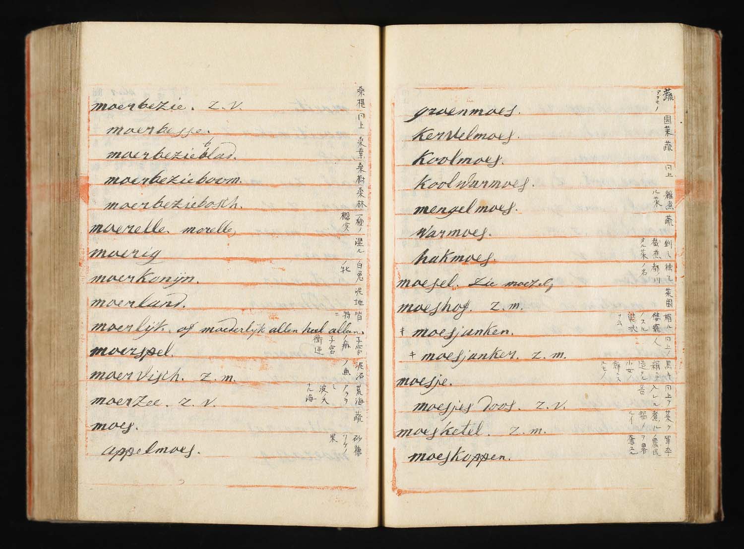 解説:波留麻和解(はるまわげ)は寛政8年(1796)に成立したわが国最初の蘭和辞書である。蘭学者稲村三伯(1759-1811)が石井恒右衛門、宇田川玄随らの協力を得て、オランダの出版業者フランソワ・ハルマ Francois Halma(1653-1722)の著わした蘭仏辞典 Woordenboek der Nederduitsche en Fransche Taale, 1708 を底本として、オランダ語の見出し語一つ一つに和訳語をあてたものである。また、稲村三伯のものとは別に、オランダ商館長ヘンデレキ・ドゥーフの指導のもとに、同じハルマの蘭仏辞典を用いて中山得十郎、吉雄権之助らが文化13年(1816)に完成させた蘭和辞書を「ドゥーフハルマ」もしくは「長崎ハルマ」と通称し、稲村三伯のものはこれに対して「江戸ハルマ」と呼ばれる。「波留麻和解」はその後の蘭学の発達や海外文献の翻訳の進展に、おおいに与って力があり、大きな影響を与えた文化史的意義の大きな資料である。たとえば、オランダ語の「ナトゥール」(natuur)に、もともと中国語で道教的な意味を持っていた「自然」という訳語をあてたのも、この「波留麻和解」においてであり、西洋文明と近代文明を受容してゆく過程において、日本語を大きく変え、ひいては日本人の意識を変える原動力ともなった書物ということができる。