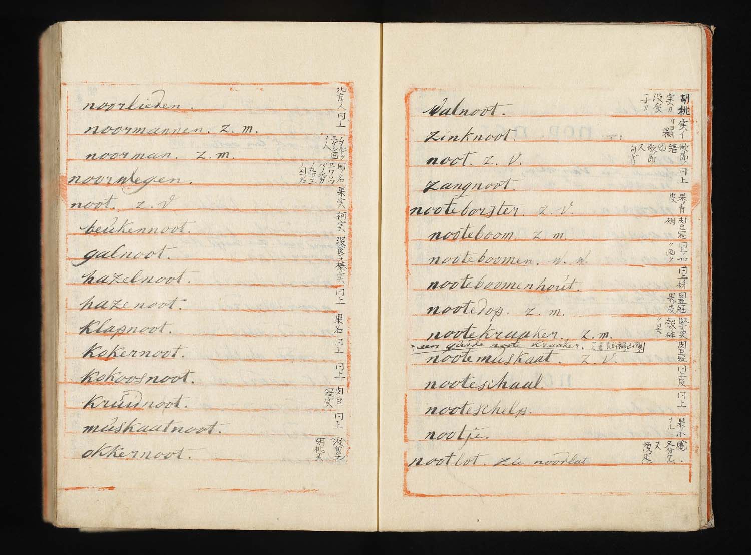 解説:波留麻和解(はるまわげ)は寛政8年(1796)に成立したわが国最初の蘭和辞書である。蘭学者稲村三伯(1759-1811)が石井恒右衛門、宇田川玄随らの協力を得て、オランダの出版業者フランソワ・ハルマ Francois Halma(1653-1722)の著わした蘭仏辞典 Woordenboek der Nederduitsche en Fransche Taale, 1708 を底本として、オランダ語の見出し語一つ一つに和訳語をあてたものである。また、稲村三伯のものとは別に、オランダ商館長ヘンデレキ・ドゥーフの指導のもとに、同じハルマの蘭仏辞典を用いて中山得十郎、吉雄権之助らが文化13年(1816)に完成させた蘭和辞書を「ドゥーフハルマ」もしくは「長崎ハルマ」と通称し、稲村三伯のものはこれに対して「江戸ハルマ」と呼ばれる。「波留麻和解」はその後の蘭学の発達や海外文献の翻訳の進展に、おおいに与って力があり、大きな影響を与えた文化史的意義の大きな資料である。たとえば、オランダ語の「ナトゥール」(natuur)に、もともと中国語で道教的な意味を持っていた「自然」という訳語をあてたのも、この「波留麻和解」においてであり、西洋文明と近代文明を受容してゆく過程において、日本語を大きく変え、ひいては日本人の意識を変える原動力ともなった書物ということができる。
