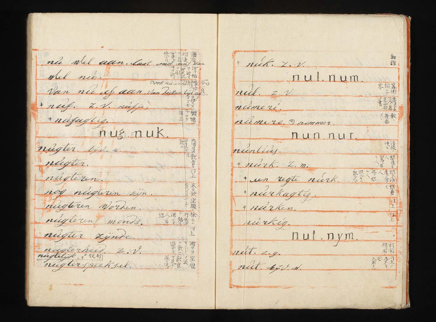 解説:波留麻和解(はるまわげ)は寛政8年(1796)に成立したわが国最初の蘭和辞書である。蘭学者稲村三伯(1759-1811)が石井恒右衛門、宇田川玄随らの協力を得て、オランダの出版業者フランソワ・ハルマ Francois Halma(1653-1722)の著わした蘭仏辞典 Woordenboek der Nederduitsche en Fransche Taale, 1708 を底本として、オランダ語の見出し語一つ一つに和訳語をあてたものである。また、稲村三伯のものとは別に、オランダ商館長ヘンデレキ・ドゥーフの指導のもとに、同じハルマの蘭仏辞典を用いて中山得十郎、吉雄権之助らが文化13年(1816)に完成させた蘭和辞書を「ドゥーフハルマ」もしくは「長崎ハルマ」と通称し、稲村三伯のものはこれに対して「江戸ハルマ」と呼ばれる。「波留麻和解」はその後の蘭学の発達や海外文献の翻訳の進展に、おおいに与って力があり、大きな影響を与えた文化史的意義の大きな資料である。たとえば、オランダ語の「ナトゥール」(natuur)に、もともと中国語で道教的な意味を持っていた「自然」という訳語をあてたのも、この「波留麻和解」においてであり、西洋文明と近代文明を受容してゆく過程において、日本語を大きく変え、ひいては日本人の意識を変える原動力ともなった書物ということができる。