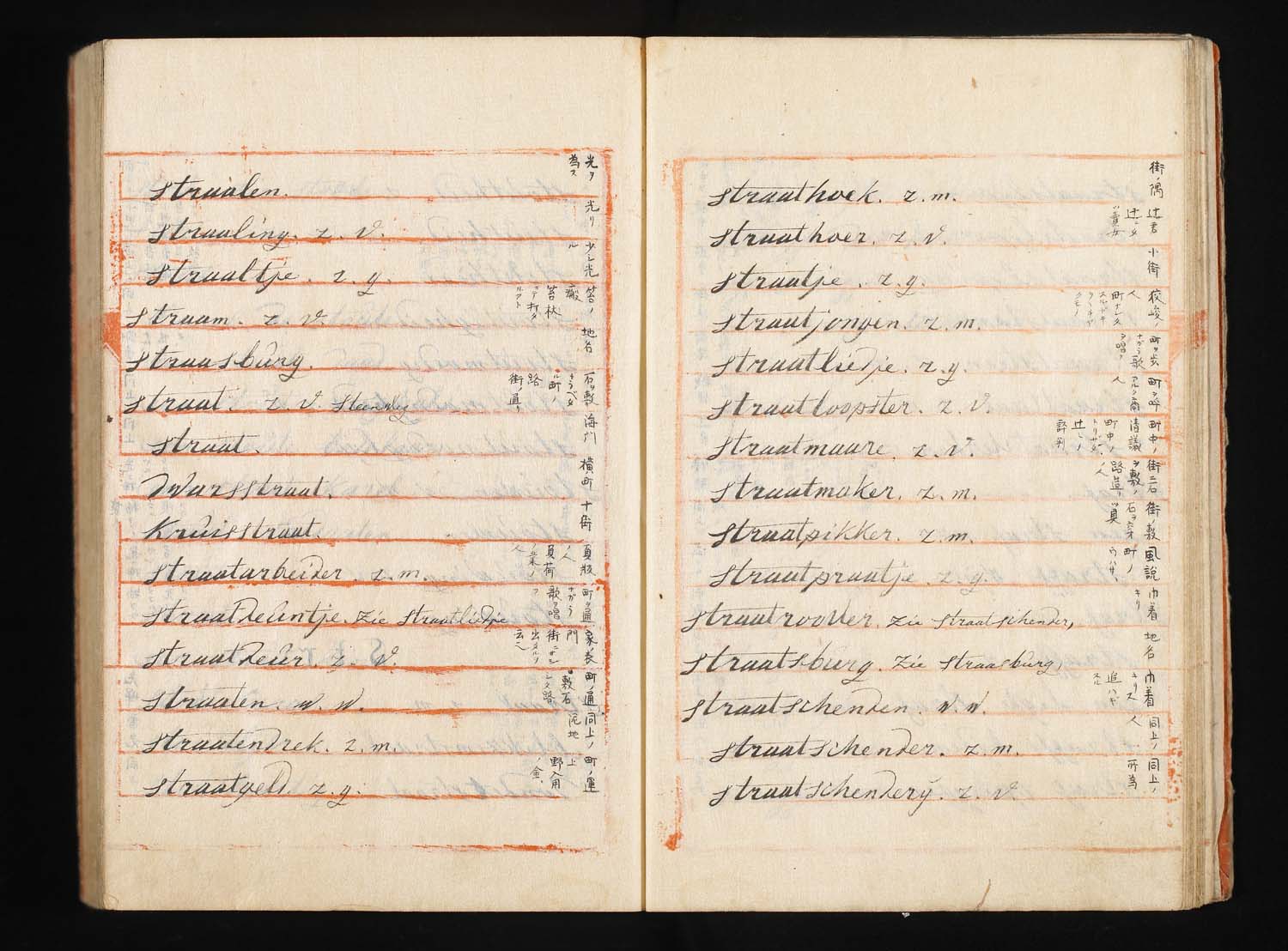 解説:波留麻和解(はるまわげ)は寛政8年(1796)に成立したわが国最初の蘭和辞書である。蘭学者稲村三伯(1759-1811)が石井恒右衛門、宇田川玄随らの協力を得て、オランダの出版業者フランソワ・ハルマ Francois Halma(1653-1722)の著わした蘭仏辞典 Woordenboek der Nederduitsche en Fransche Taale, 1708 を底本として、オランダ語の見出し語一つ一つに和訳語をあてたものである。また、稲村三伯のものとは別に、オランダ商館長ヘンデレキ・ドゥーフの指導のもとに、同じハルマの蘭仏辞典を用いて中山得十郎、吉雄権之助らが文化13年(1816)に完成させた蘭和辞書を「ドゥーフハルマ」もしくは「長崎ハルマ」と通称し、稲村三伯のものはこれに対して「江戸ハルマ」と呼ばれる。「波留麻和解」はその後の蘭学の発達や海外文献の翻訳の進展に、おおいに与って力があり、大きな影響を与えた文化史的意義の大きな資料である。たとえば、オランダ語の「ナトゥール」(natuur)に、もともと中国語で道教的な意味を持っていた「自然」という訳語をあてたのも、この「波留麻和解」においてであり、西洋文明と近代文明を受容してゆく過程において、日本語を大きく変え、ひいては日本人の意識を変える原動力ともなった書物ということができる。