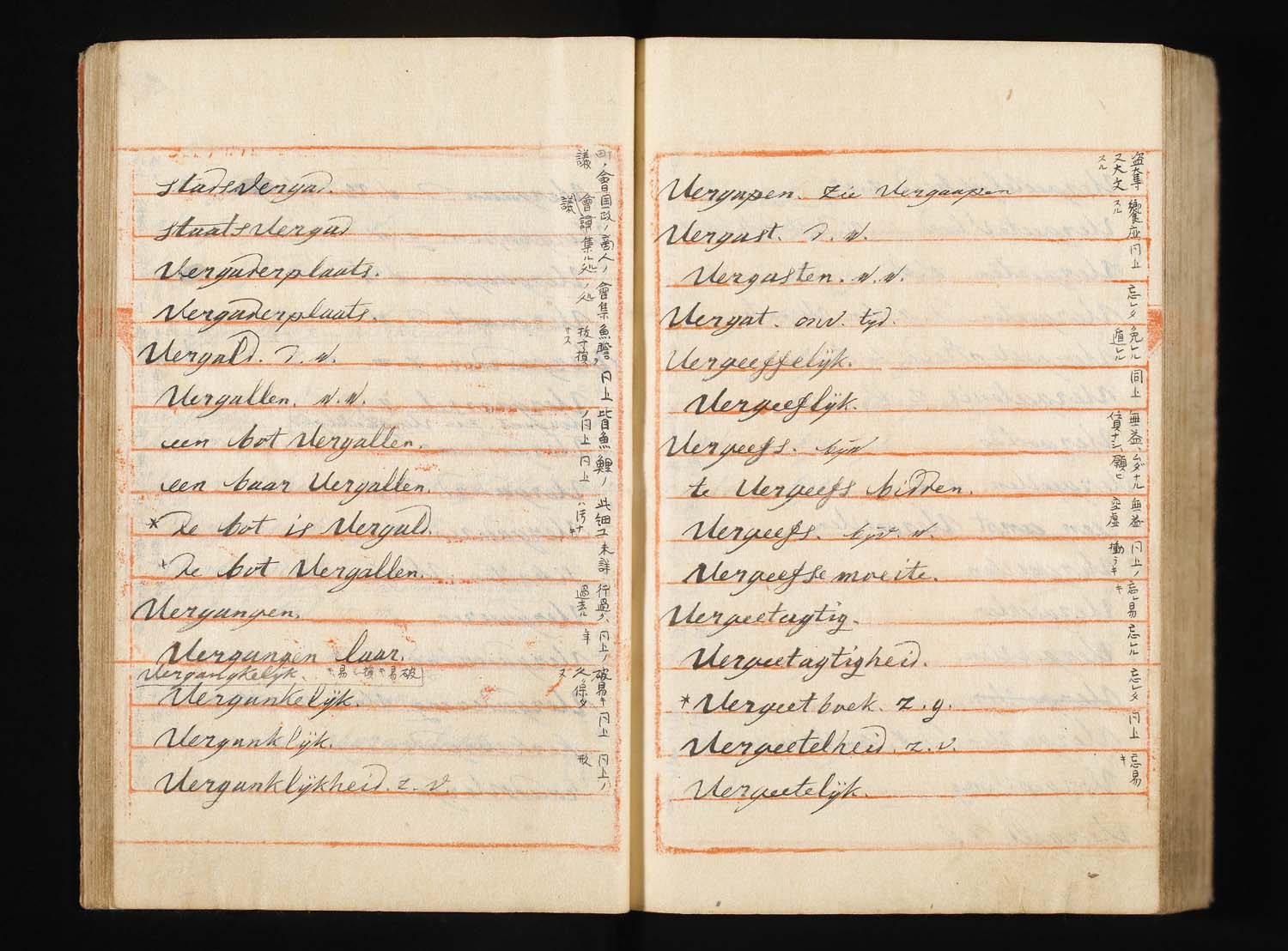 解説:波留麻和解(はるまわげ)は寛政8年(1796)に成立したわが国最初の蘭和辞書である。蘭学者稲村三伯(1759-1811)が石井恒右衛門、宇田川玄随らの協力を得て、オランダの出版業者フランソワ・ハルマ Francois Halma(1653-1722)の著わした蘭仏辞典 Woordenboek der Nederduitsche en Fransche Taale, 1708 を底本として、オランダ語の見出し語一つ一つに和訳語をあてたものである。また、稲村三伯のものとは別に、オランダ商館長ヘンデレキ・ドゥーフの指導のもとに、同じハルマの蘭仏辞典を用いて中山得十郎、吉雄権之助らが文化13年(1816)に完成させた蘭和辞書を「ドゥーフハルマ」もしくは「長崎ハルマ」と通称し、稲村三伯のものはこれに対して「江戸ハルマ」と呼ばれる。「波留麻和解」はその後の蘭学の発達や海外文献の翻訳の進展に、おおいに与って力があり、大きな影響を与えた文化史的意義の大きな資料である。たとえば、オランダ語の「ナトゥール」(natuur)に、もともと中国語で道教的な意味を持っていた「自然」という訳語をあてたのも、この「波留麻和解」においてであり、西洋文明と近代文明を受容してゆく過程において、日本語を大きく変え、ひいては日本人の意識を変える原動力ともなった書物ということができる。