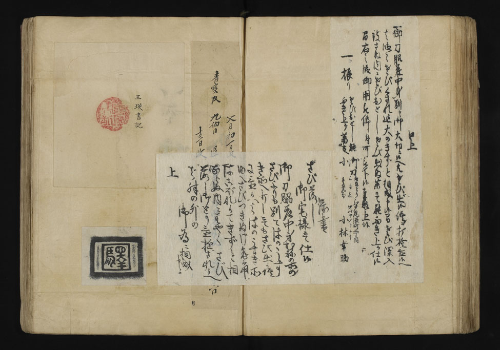 請求記号:文庫08 J53(1 2) ; 製作・刊行年等:文化元年 ; 数量:二冊 ; 材質:紙本彩色 ; 大きさ:27×22.6 ; 解説文:森島中良(1754-1810)は桂川国瑞の弟で、蘭学者としてのみならず、森羅万象、二世風来山人などの号をもつ戯作者としても名高い。長崎に舶載された珍しい品物の広告や商標、蘭文など雑多なものが貼り込まれている。