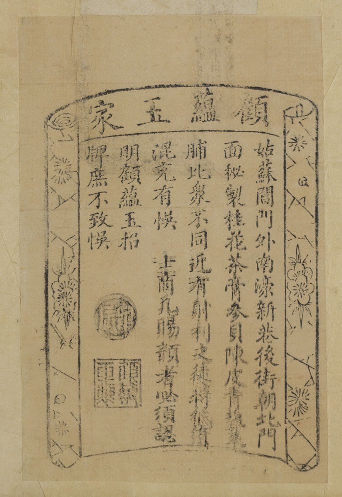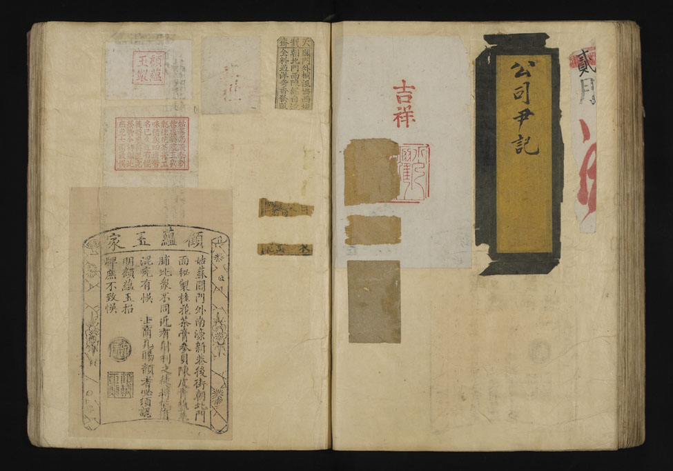 請求記号:文庫08 J53(1 2) ; 製作・刊行年等:文化元年 ; 数量:二冊 ; 材質:紙本彩色 ; 大きさ:27×22.6 ; 解説文:森島中良(1754-1810)は桂川国瑞の弟で、蘭学者としてのみならず、森羅万象、二世風来山人などの号をもつ戯作者としても名高い。長崎に舶載された珍しい品物の広告や商標、蘭文など雑多なものが貼り込まれている。