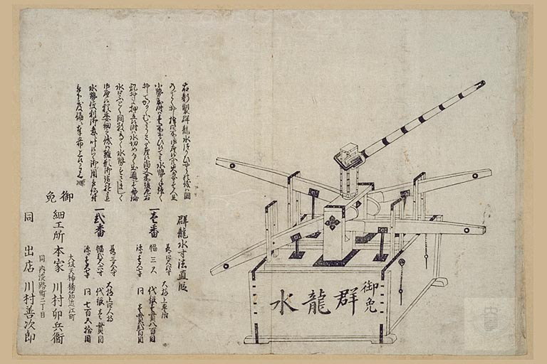 制作刊行年等: ; 出版地等:大坂 ; 請求記号:文庫10 8006 2 ; 材質: ; 数量:1枚 ; 大きさ:32×46cm ; 解説文:和製ポンプの引札。石井研堂の『明治事物起原』によれば、長崎の人がオランダ人に教わって木製の手押しポンプを製作したのが宝暦3年という。その後、それを大規模にしたものが「龍吐水」などと名づけ売出された。この「群龍水」もその一つである。 ; Osaka ; 1 sheet ; 32×46cm ; Ad for a made-in-Japan pump. According to Meiji jibutsu kigen [Origins of Meiji Artifacts] by Ishii Kendo, it was in the 3rd year of Horeki (1753) that a wooden handpump was created by a man in Nagasaki with instructions from a Dutchman. Larger-scale pumps based on this model were later produced and placed on the market under such names as "Ryutosui" (lit., "dragon-spouting font"). The pump in this ad, "Gunryusui" (lit., "crowding-dragons font") was one of them.