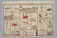 制作刊行年等:明治23年12月 ; 出版地等:東京 ; 請求記号:文庫10 8482 ; 材質: ; 数量:1枚 ; 大きさ:50×71cm ; 解説文:月刊『少年文武』の年末号付録として出版された娯楽用双六。一介の書生があるいは放蕩しあるいは零落し、壮士となり官吏となるという数奇な運命に翻弄されながら、遂には功成り名遂げて「上り」にいたるという趣向。 ; December 1890 ; Tokyo ; 1 sheet ; This is an entertaining sugoroku included as an extra to the 1890 year-end issue of the monthly Shonen bunbu [The Boys’ Pen and Sword]. The story alternatives offered in this game include leading a dissolute life or being financially ruined, becoming a brave hero or government official, taking the players through the vicissitudes of fortune until they reach the goal: the student's success in life.