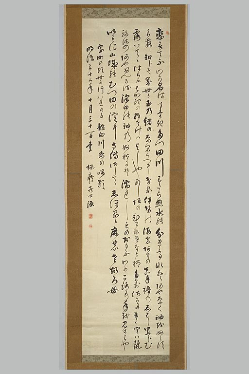 制作刊行年等:明治32年 ; 出版地等: ; 請求記号:文庫10 8817 ; 材質: ; 数量:1軸 ; 大きさ:134×36cm ; 解説文:明治を代表する大記者桜痴は、長崎出身、幕末に二度も渡欧した新知識の人であった。『江湖新聞』で新政府の忌諱に触れ下獄、のち『東京日日新聞』で政府擁護の論陣を張り、民権派と対立した。晩年は演劇改良運動を唱道した。 ; 1899 ; 1 scroll ; A leading journalist of the Meiji period, Fukuchi Ochi was a native of Nagasaki. He traveled twice to Europe toward the end of the Edo period, and was familiar with things Western. He aroused the new government’s ire with his pro-shogunate Koko shinbun and was sent to prison. He later committed himself to the Meiji government in the Tokyo nichinichi shinbun, in which capacity he came into conflict with proponents of the people's rights movement. In his later years, he became an advocate of reform in the theater.