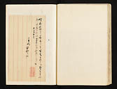 請求記号:チ6−4415−(1〜61) ; 東京の古書肆、文行堂横尾勇之助が戦前に収集した江戸時代・明治時代の文人・学者などの自筆一枚物資料の貼込帖61冊。一つ一つは短冊や署名、小書簡など短い資料であるが「捨て難い」ところから集められとっておかれた。戦争中は地中に埋め難をのがれたという逸話も伝わっている。収録されている著者の一部をあげると、国学者の山崎美成、屋代弘賢、前田夏蔭、狩谷■(木偏に夜)斎、書家の巻菱湖、俳人松木淡々、明治の人では幸田露伴、仮名垣魯文、乃木希典、中村正直、守田宝丹など多彩な1000人近い顔ぶれの自筆資料がみられ、いずれも未公開のものである。