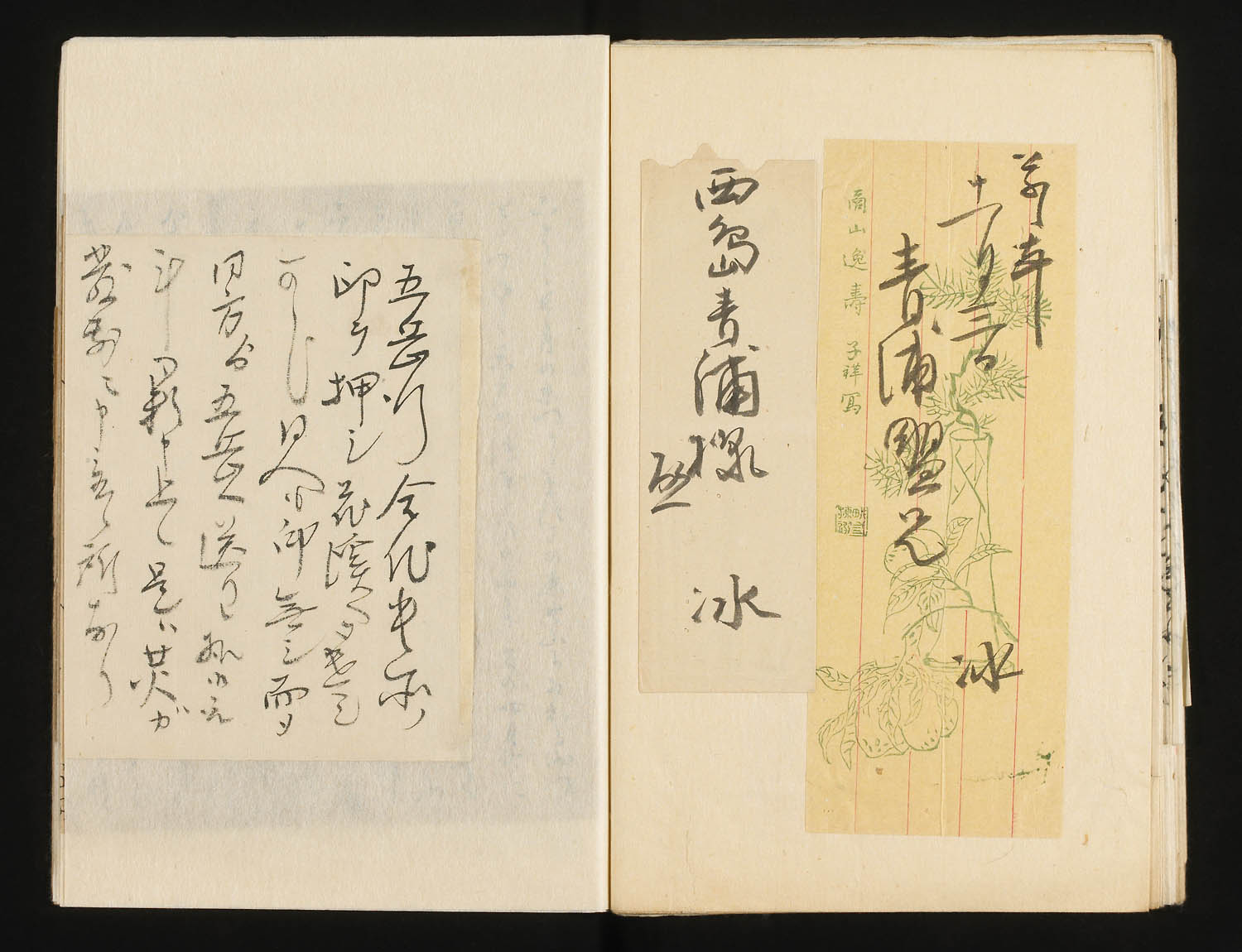 請求記号:チ6−4415−(1〜61) ; 東京の古書肆、文行堂横尾勇之助が戦前に収集した江戸時代・明治時代の文人・学者などの自筆一枚物資料の貼込帖61冊。一つ一つは短冊や署名、小書簡など短い資料であるが「捨て難い」ところから集められとっておかれた。戦争中は地中に埋め難をのがれたという逸話も伝わっている。収録されている著者の一部をあげると、国学者の山崎美成、屋代弘賢、前田夏蔭、狩谷■(木偏に夜)斎、書家の巻菱湖、俳人松木淡々、明治の人では幸田露伴、仮名垣魯文、乃木希典、中村正直、守田宝丹など多彩な1000人近い顔ぶれの自筆資料がみられ、いずれも未公開のものである。