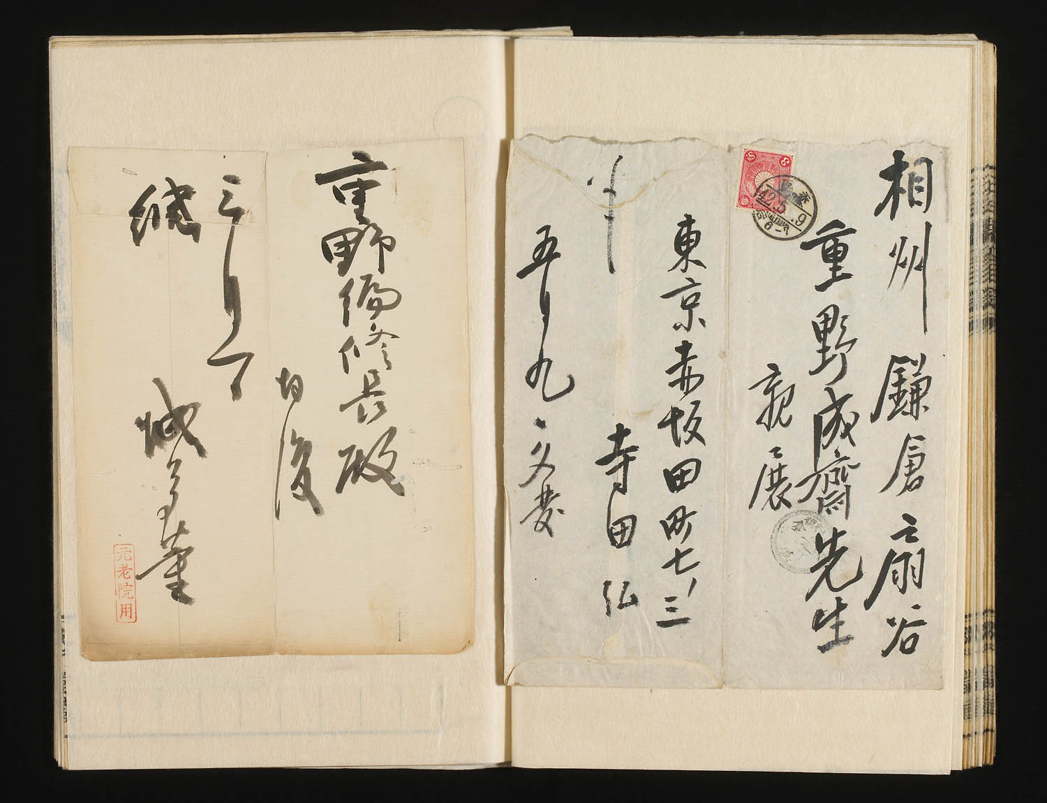 請求記号:チ6−4415−(1〜61) ; 東京の古書肆、文行堂横尾勇之助が戦前に収集した江戸時代・明治時代の文人・学者などの自筆一枚物資料の貼込帖61冊。一つ一つは短冊や署名、小書簡など短い資料であるが「捨て難い」ところから集められとっておかれた。戦争中は地中に埋め難をのがれたという逸話も伝わっている。収録されている著者の一部をあげると、国学者の山崎美成、屋代弘賢、前田夏蔭、狩谷■(木偏に夜)斎、書家の巻菱湖、俳人松木淡々、明治の人では幸田露伴、仮名垣魯文、乃木希典、中村正直、守田宝丹など多彩な1000人近い顔ぶれの自筆資料がみられ、いずれも未公開のものである。