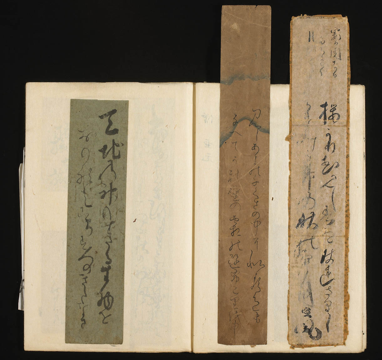 請求記号:チ6−4415−(1〜61) ; 東京の古書肆、文行堂横尾勇之助が戦前に収集した江戸時代・明治時代の文人・学者などの自筆一枚物資料の貼込帖61冊。一つ一つは短冊や署名、小書簡など短い資料であるが「捨て難い」ところから集められとっておかれた。戦争中は地中に埋め難をのがれたという逸話も伝わっている。収録されている著者の一部をあげると、国学者の山崎美成、屋代弘賢、前田夏蔭、狩谷■(木偏に夜)斎、書家の巻菱湖、俳人松木淡々、明治の人では幸田露伴、仮名垣魯文、乃木希典、中村正直、守田宝丹など多彩な1000人近い顔ぶれの自筆資料がみられ、いずれも未公開のものである。