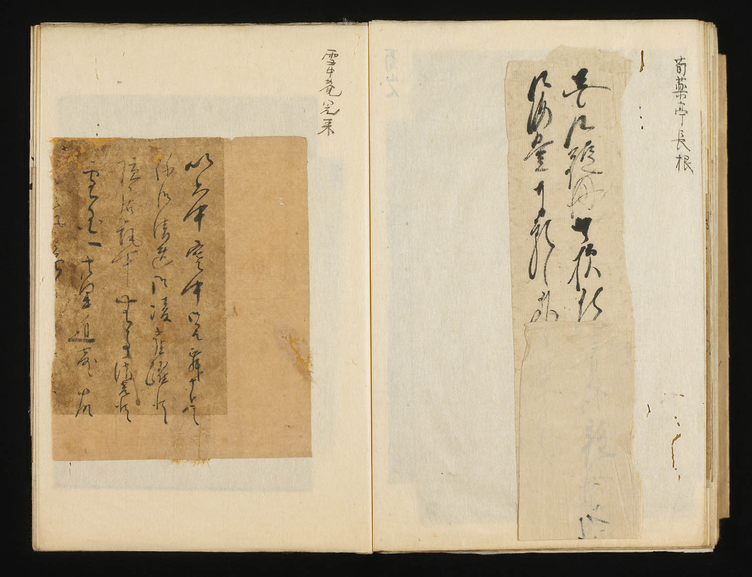 請求記号:チ6−4415−(1〜61) ; 東京の古書肆、文行堂横尾勇之助が戦前に収集した江戸時代・明治時代の文人・学者などの自筆一枚物資料の貼込帖61冊。一つ一つは短冊や署名、小書簡など短い資料であるが「捨て難い」ところから集められとっておかれた。戦争中は地中に埋め難をのがれたという逸話も伝わっている。収録されている著者の一部をあげると、国学者の山崎美成、屋代弘賢、前田夏蔭、狩谷■(木偏に夜)斎、書家の巻菱湖、俳人松木淡々、明治の人では幸田露伴、仮名垣魯文、乃木希典、中村正直、守田宝丹など多彩な1000人近い顔ぶれの自筆資料がみられ、いずれも未公開のものである。