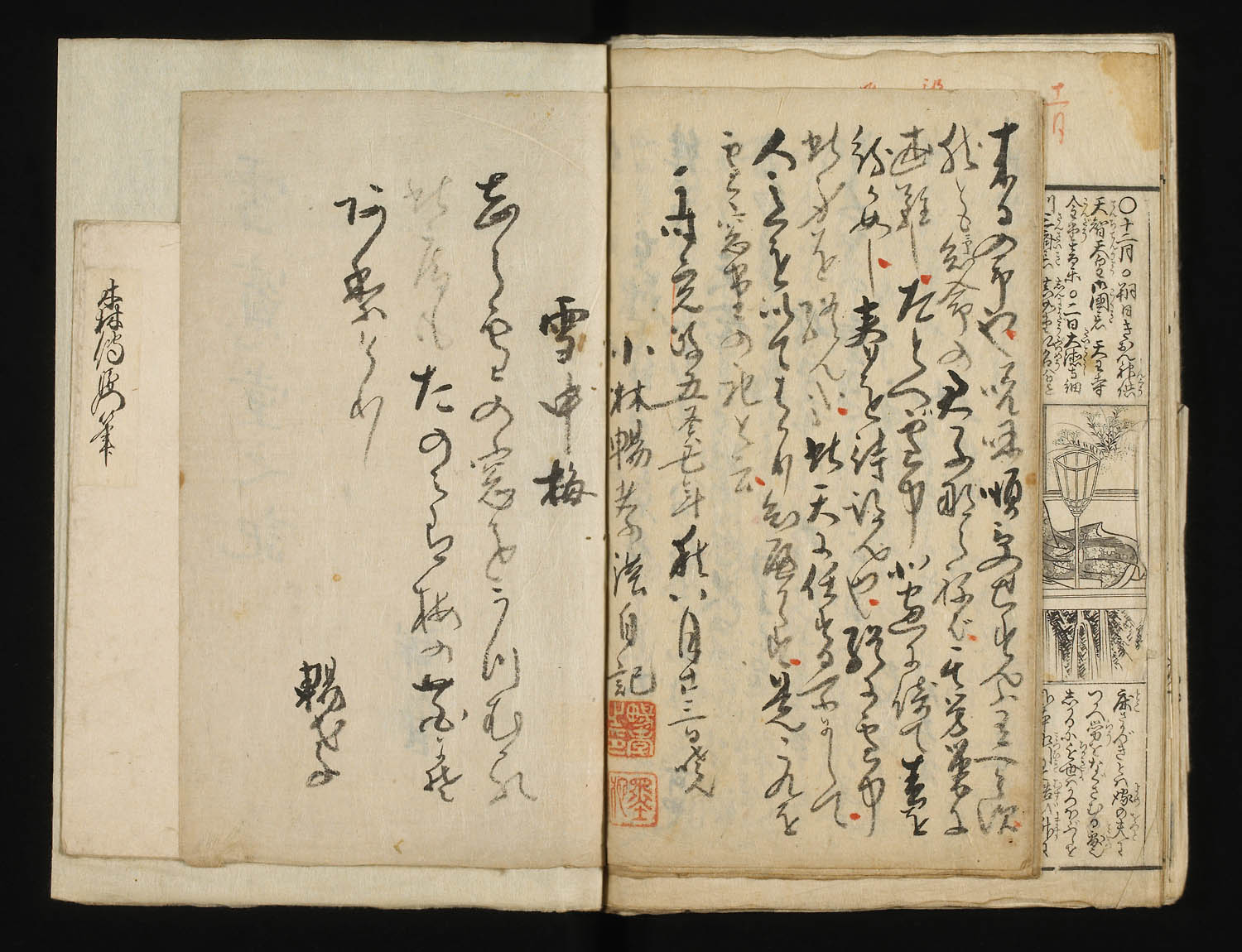 請求記号:チ6−4415−(1〜61) ; 東京の古書肆、文行堂横尾勇之助が戦前に収集した江戸時代・明治時代の文人・学者などの自筆一枚物資料の貼込帖61冊。一つ一つは短冊や署名、小書簡など短い資料であるが「捨て難い」ところから集められとっておかれた。戦争中は地中に埋め難をのがれたという逸話も伝わっている。収録されている著者の一部をあげると、国学者の山崎美成、屋代弘賢、前田夏蔭、狩谷■(木偏に夜)斎、書家の巻菱湖、俳人松木淡々、明治の人では幸田露伴、仮名垣魯文、乃木希典、中村正直、守田宝丹など多彩な1000人近い顔ぶれの自筆資料がみられ、いずれも未公開のものである。