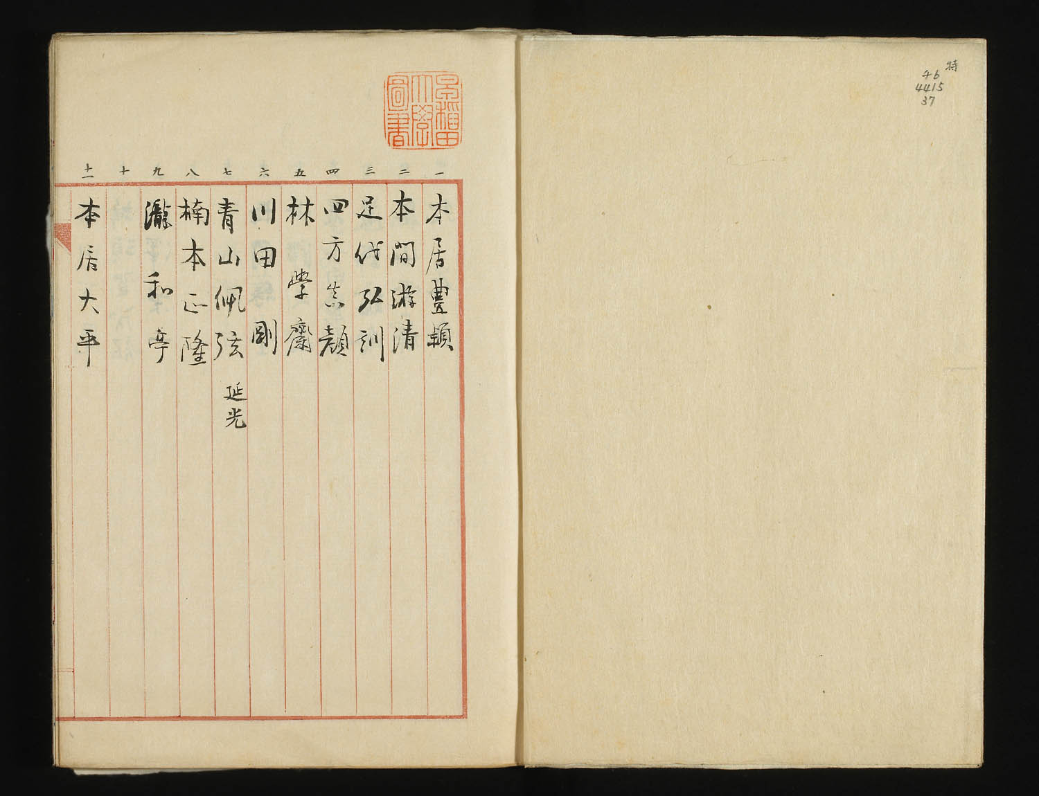 請求記号:チ6−4415−(1〜61) ; 東京の古書肆、文行堂横尾勇之助が戦前に収集した江戸時代・明治時代の文人・学者などの自筆一枚物資料の貼込帖61冊。一つ一つは短冊や署名、小書簡など短い資料であるが「捨て難い」ところから集められとっておかれた。戦争中は地中に埋め難をのがれたという逸話も伝わっている。収録されている著者の一部をあげると、国学者の山崎美成、屋代弘賢、前田夏蔭、狩谷■(木偏に夜)斎、書家の巻菱湖、俳人松木淡々、明治の人では幸田露伴、仮名垣魯文、乃木希典、中村正直、守田宝丹など多彩な1000人近い顔ぶれの自筆資料がみられ、いずれも未公開のものである。