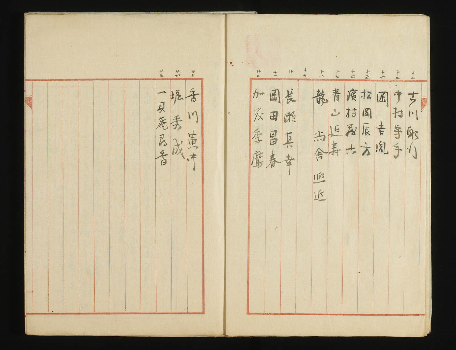 請求記号:チ6−4415−(1〜61) ; 東京の古書肆、文行堂横尾勇之助が戦前に収集した江戸時代・明治時代の文人・学者などの自筆一枚物資料の貼込帖61冊。一つ一つは短冊や署名、小書簡など短い資料であるが「捨て難い」ところから集められとっておかれた。戦争中は地中に埋め難をのがれたという逸話も伝わっている。収録されている著者の一部をあげると、国学者の山崎美成、屋代弘賢、前田夏蔭、狩谷■(木偏に夜)斎、書家の巻菱湖、俳人松木淡々、明治の人では幸田露伴、仮名垣魯文、乃木希典、中村正直、守田宝丹など多彩な1000人近い顔ぶれの自筆資料がみられ、いずれも未公開のものである。