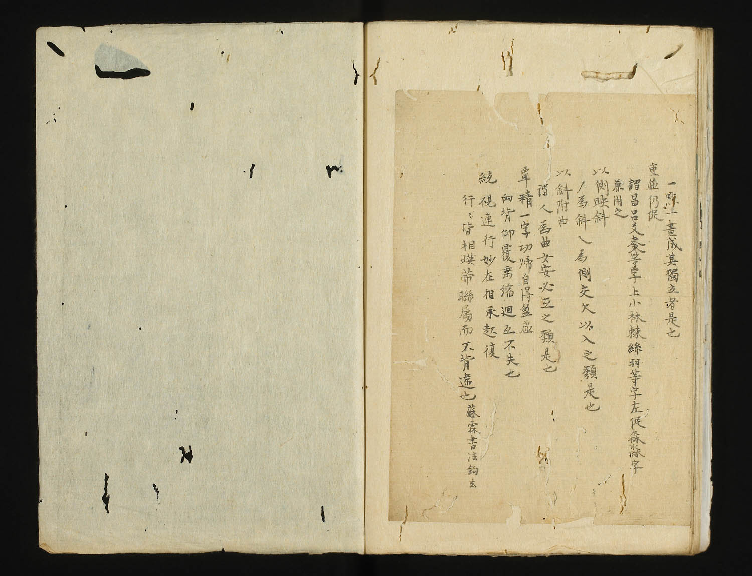 請求記号:チ6−4415−(1〜61) ; 東京の古書肆、文行堂横尾勇之助が戦前に収集した江戸時代・明治時代の文人・学者などの自筆一枚物資料の貼込帖61冊。一つ一つは短冊や署名、小書簡など短い資料であるが「捨て難い」ところから集められとっておかれた。戦争中は地中に埋め難をのがれたという逸話も伝わっている。収録されている著者の一部をあげると、国学者の山崎美成、屋代弘賢、前田夏蔭、狩谷■(木偏に夜)斎、書家の巻菱湖、俳人松木淡々、明治の人では幸田露伴、仮名垣魯文、乃木希典、中村正直、守田宝丹など多彩な1000人近い顔ぶれの自筆資料がみられ、いずれも未公開のものである。