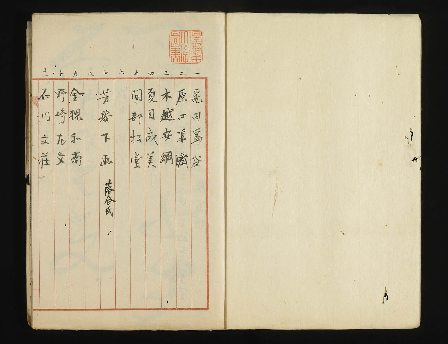 請求記号:チ6−4415−(1〜61) ; 東京の古書肆、文行堂横尾勇之助が戦前に収集した江戸時代・明治時代の文人・学者などの自筆一枚物資料の貼込帖61冊。一つ一つは短冊や署名、小書簡など短い資料であるが「捨て難い」ところから集められとっておかれた。戦争中は地中に埋め難をのがれたという逸話も伝わっている。収録されている著者の一部をあげると、国学者の山崎美成、屋代弘賢、前田夏蔭、狩谷■(木偏に夜)斎、書家の巻菱湖、俳人松木淡々、明治の人では幸田露伴、仮名垣魯文、乃木希典、中村正直、守田宝丹など多彩な1000人近い顔ぶれの自筆資料がみられ、いずれも未公開のものである。