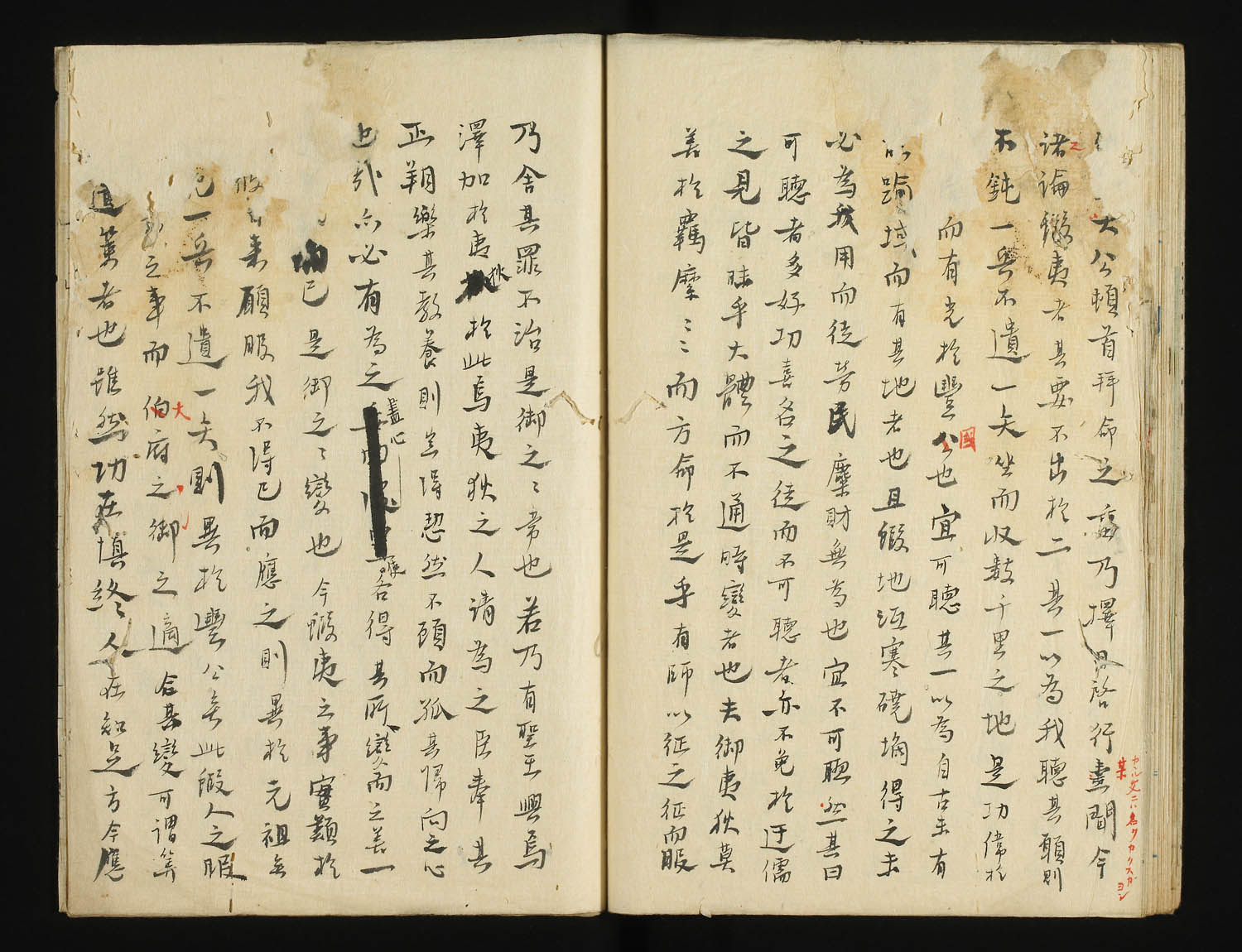 請求記号:チ6−4415−(1〜61) ; 東京の古書肆、文行堂横尾勇之助が戦前に収集した江戸時代・明治時代の文人・学者などの自筆一枚物資料の貼込帖61冊。一つ一つは短冊や署名、小書簡など短い資料であるが「捨て難い」ところから集められとっておかれた。戦争中は地中に埋め難をのがれたという逸話も伝わっている。収録されている著者の一部をあげると、国学者の山崎美成、屋代弘賢、前田夏蔭、狩谷■(木偏に夜)斎、書家の巻菱湖、俳人松木淡々、明治の人では幸田露伴、仮名垣魯文、乃木希典、中村正直、守田宝丹など多彩な1000人近い顔ぶれの自筆資料がみられ、いずれも未公開のものである。