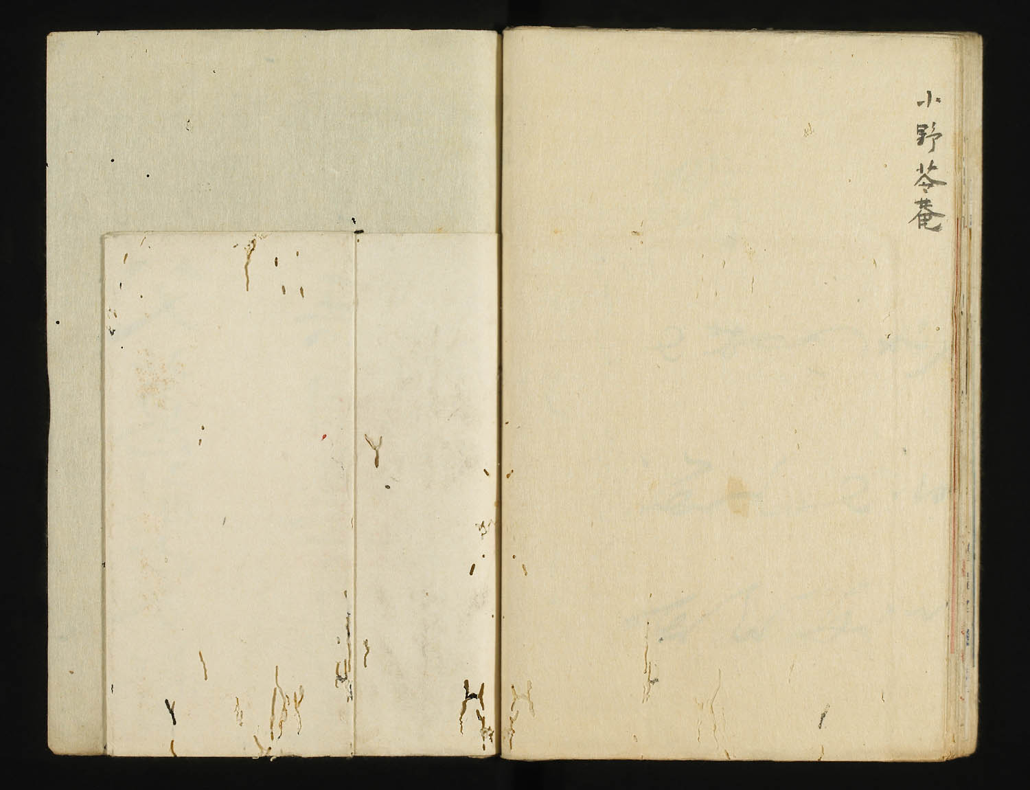 請求記号:チ6−4415−(1〜61) ; 東京の古書肆、文行堂横尾勇之助が戦前に収集した江戸時代・明治時代の文人・学者などの自筆一枚物資料の貼込帖61冊。一つ一つは短冊や署名、小書簡など短い資料であるが「捨て難い」ところから集められとっておかれた。戦争中は地中に埋め難をのがれたという逸話も伝わっている。収録されている著者の一部をあげると、国学者の山崎美成、屋代弘賢、前田夏蔭、狩谷■(木偏に夜)斎、書家の巻菱湖、俳人松木淡々、明治の人では幸田露伴、仮名垣魯文、乃木希典、中村正直、守田宝丹など多彩な1000人近い顔ぶれの自筆資料がみられ、いずれも未公開のものである。