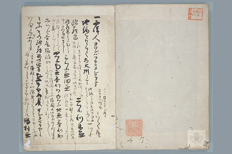請求記号:ロ12 1116 ; 製作・刊行年等:宝永5年 ; 数量:四冊(丁) ; 解説文:宝永5年、天主教布教のため潜入したイタリア人宣教師シローテ(シドッチ)を白石が訊問した折の自筆覚書。自筆の『詩経図総目』草稿と合綴されている。