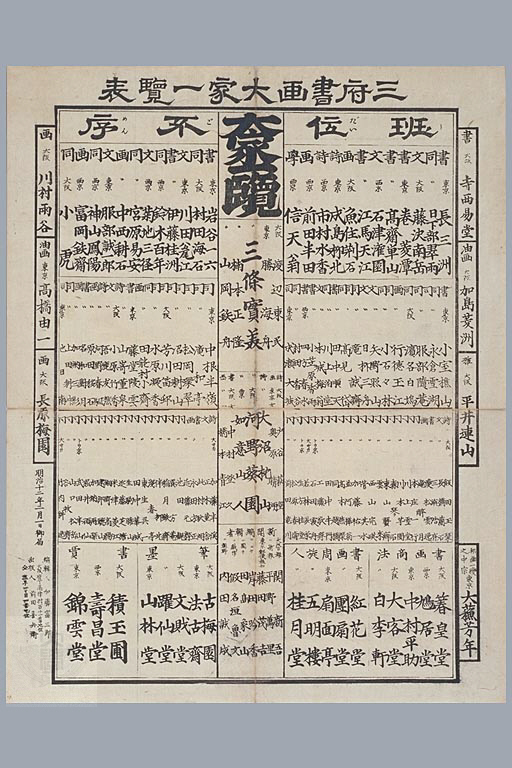 請求記号 : ヲ6 3145 60 ; 年代 :明治12年2月 ; 出版地 :大阪 ; 出版者 :前田喜兵衛版 ; 番付内容 :東京・京都・大阪在住書家・画家・詩人等名家番付 ; Request No. : Wo6 3145 60 ; Year : Feb. 1879 ; Place : Osaka ; Publisher : MaedaKihei ; Content : Noted calligraphers, painters, poets in Tokyo, Kyoto, Osaka |